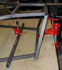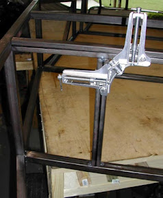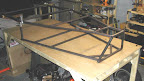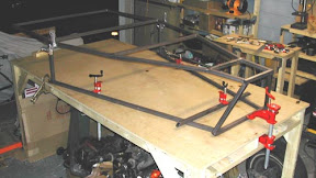 The completed upper rail, front end, lower rail layout is shown here in the inverted position. The only thing keeping the upper and lower rails properly distanced are the temporarily clamped uprights. The next step is to attach the uprights in the correct position and finalize the front half of the basic structure. |