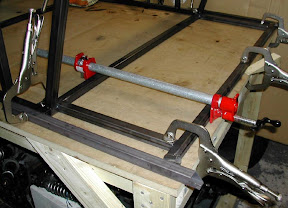 The rear bottom tubes were possibly the easiest parts to add to the custom chassis design. They sit square and flush with the existing bottom rails using simple clamps and a carpenter's square. I decided to position these rear bottom tubes flat with the deck instead of using the book design, which kicks this tube upward toward the rear at about 10 degress. Keeping the rear bottom tube flat on the deck will provide more clearance when the axle is in full droop, it will make it a little easier to install the axle when the time comes, and it simplifies the build process.