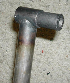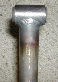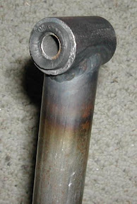 The trailing arm bushings are from a Triumph Spitfire as recommended by the book. The bushings measure 13/16" OD, 1.4" long and they take a 3/8" bolt. The bushing can be press-fit into commonly available 1"OD tubing with a .095" wall thickness.