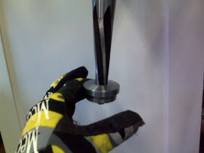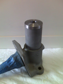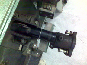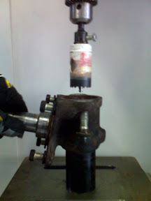 ![]() I had a local machine shop fabricate a custom strut adapter. The adapter was designed to just slip into the top of the cut-off strut. The outer diameter of the adpater agrees with the OD of the strut, making for a smooth look and providing plenty of welding surface. I applied a finishing treatment to the adapter using a high quality 7 degree taper reamer designed specifically for the ball joints that I sourced from a typical stock-car catalog. Surprisingly, I didn't need a jig to machine the taper. As shown here, I am literally holding the adapter in one hand while the taper reamer is running on a drill press at very slow speed with plenty of lubricant. I also reamed out the bottom on the RX7 strut assembly, which is actually a removable steering arm and ball joint holder (not shown). The resulting asesmbly will have both castlenuts hidden inside the strut tube for a clean, dare I say, "elegant" assembly. |